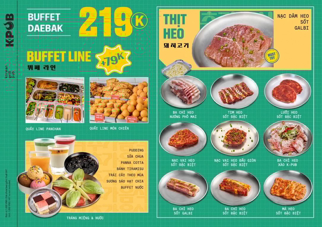 🤤Cùng hòa mình vào không khí náo nhiệt tại K-Pub để thưởng thức thịt nướng đường phố Hàn đích thực chỉ #219k/người thỏa thích các món thịt nướng từ Heo, nội tạng, và bò. Ăn kèm panchan, món Hàn truyền thống nóng hổi, sẽ mang đến những trải nghiệm hương vị cực kì mới lạ cho các tín đồ thịt nướng.