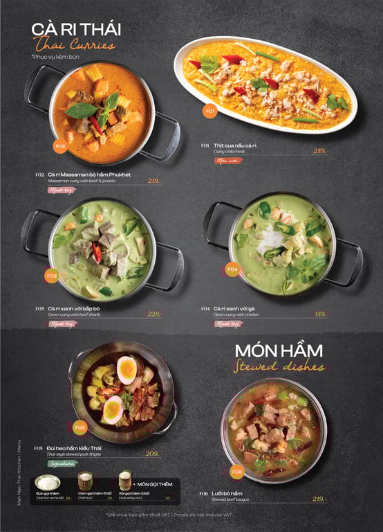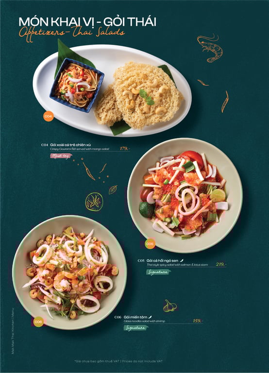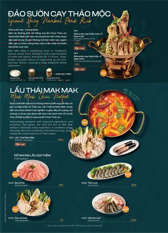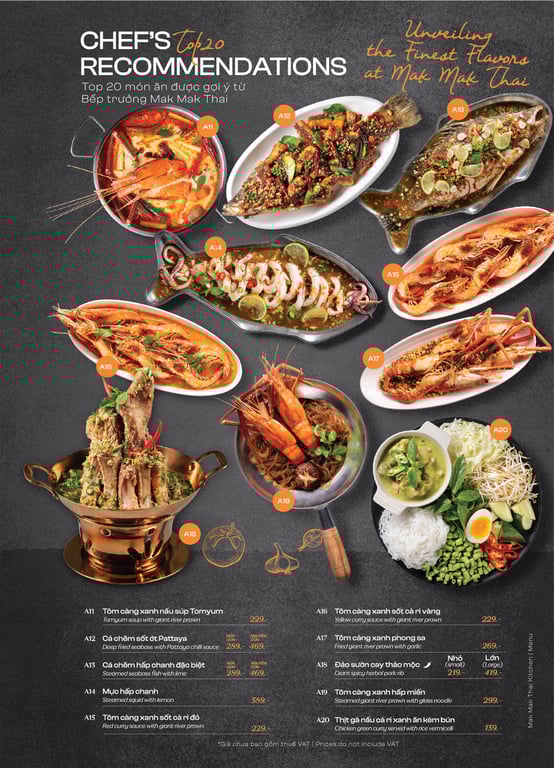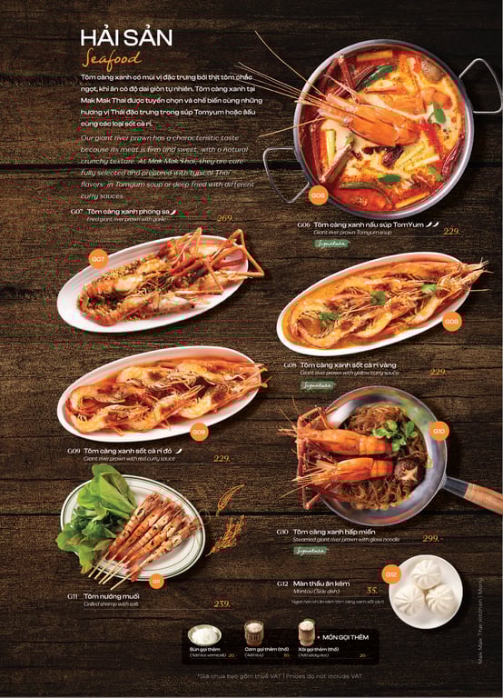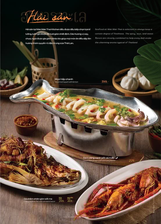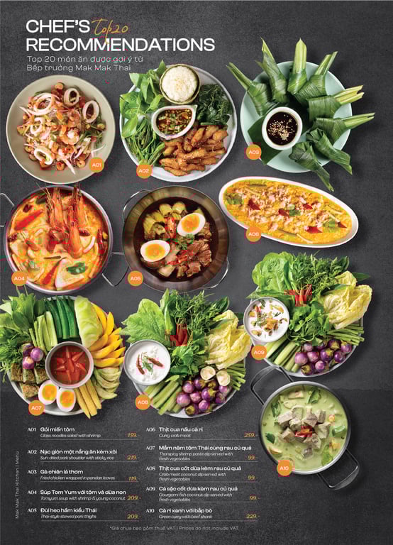 Bạn có thể thỏa mãn "cơn khát" vị Thái với menu đa dạng hơn 100 món Thái ngon tuyệt đỉnh. Từ những món ăn nổi tiếng như canh Tom Yum, cà ri xanh, vàng, đỏ, pad Thai, cho đến những món ăn bản địa có thể bạn chưa từng thử - menu Mak Mak Thai là một kho báu ẩm thực sẽ khiến vị giác của bạn "bừng tỉnh".